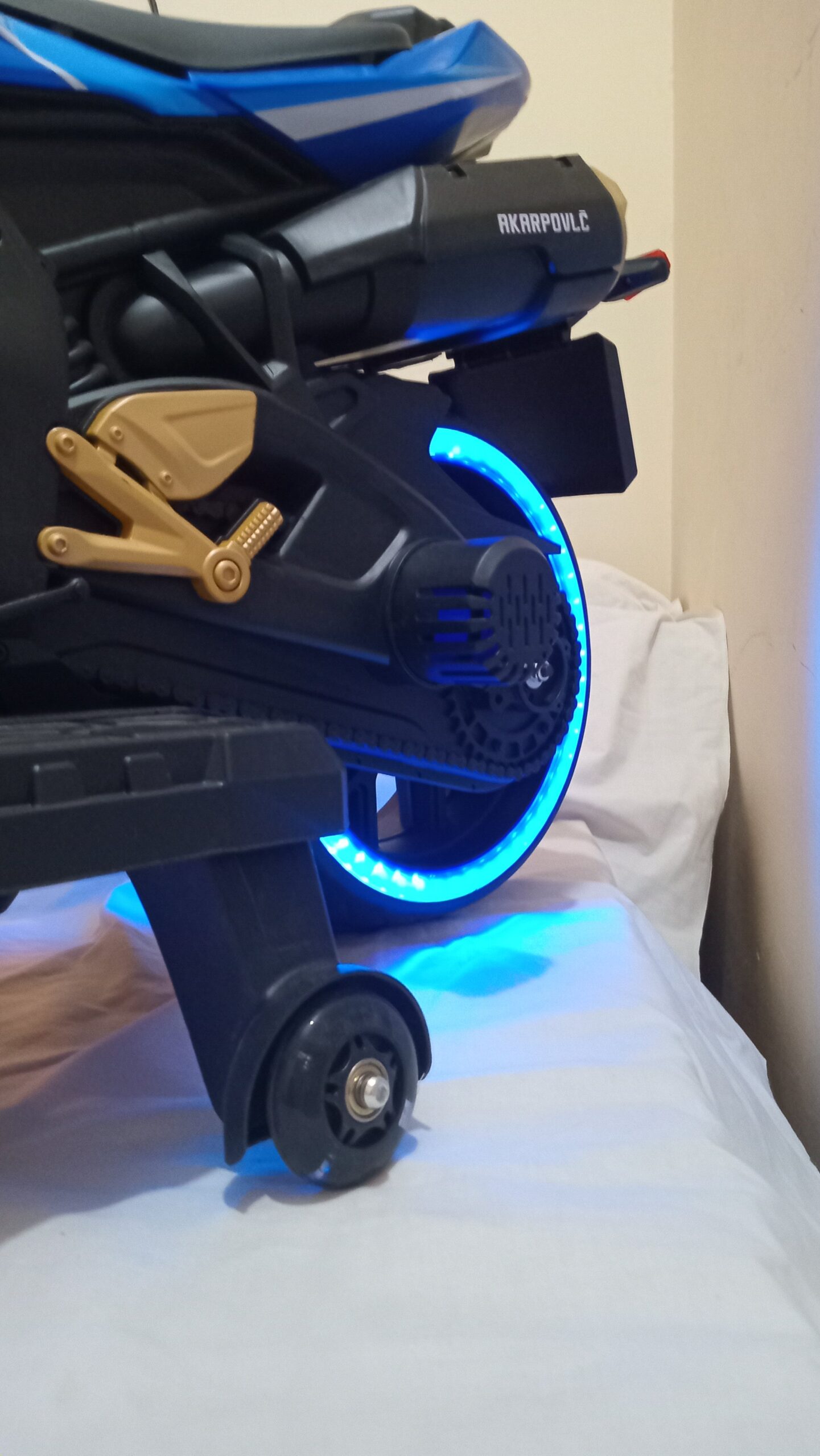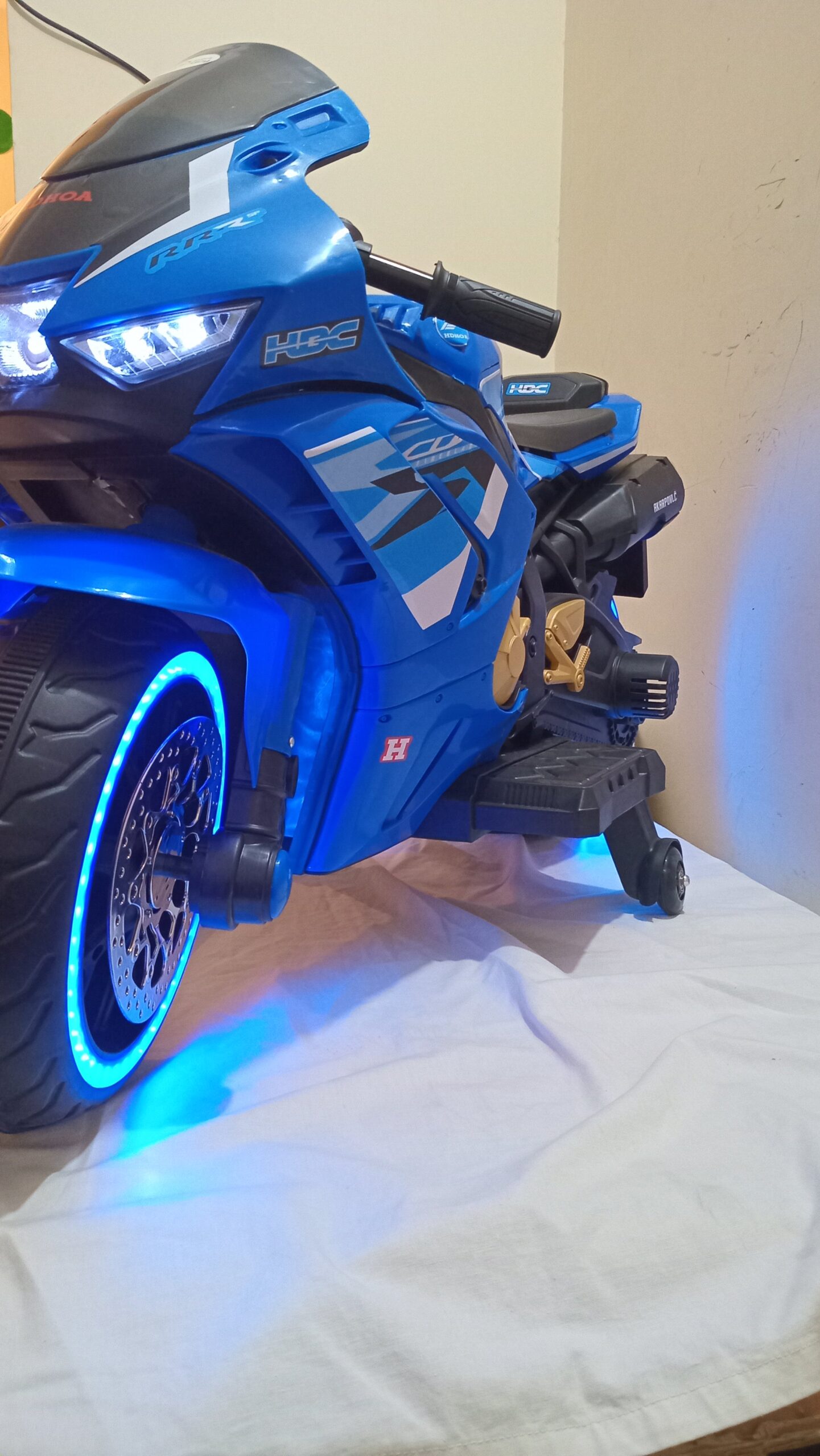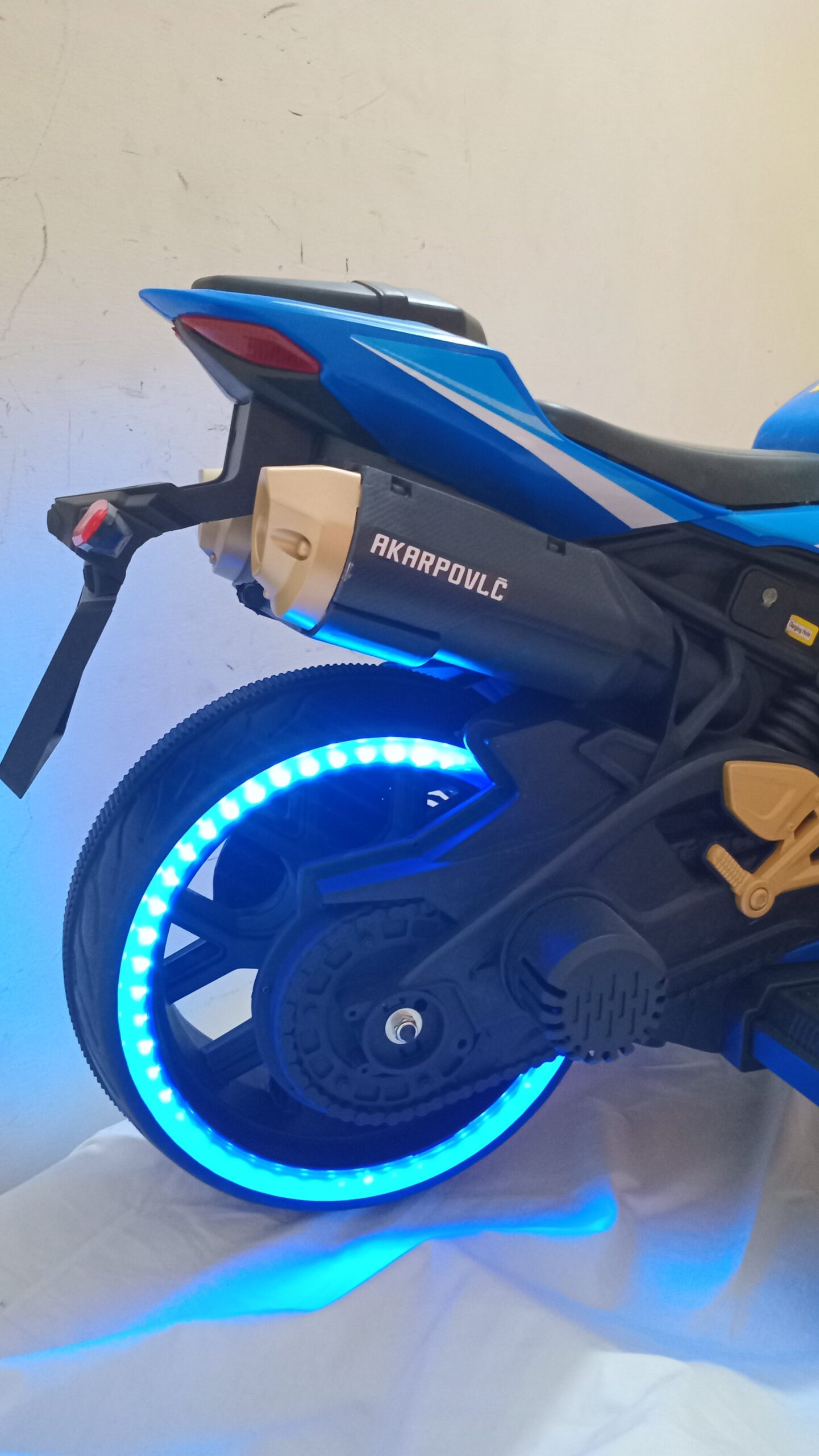 The motorbike features plastic tires and includes training wheels to ensure your child is properly supported while having fun.